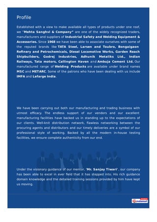 Mehta Sanghvi & Company, established in 1968, specializes in trading and supplying industrial safety and welding equipment, manufacturing products under the brands MSC and Metarc. The company has a strong reputation among major clients like Tata Steel and Indian Railways, supported by modern testing facilities and a robust distribution network. Led by Keyur Sanghvi, they provide customized solutions and maintain high production capacity to meet client needs.