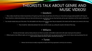 This document discusses conventions of music video genres and how they were applied in an indie rock music video. It describes conventions like costumes, props, lighting and locations commonly seen in indie rock videos. It then discusses how these conventions were used in the music video for the song "London Love" by the band Maliki. Close-ups of the artist and synchronization of visuals to the music helped adhere to typical genre conventions while limiting the budget. Ancillary materials like the album cover and magazine ad also drew from photos taken during the music video shoot.