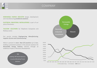 This document summarizes the services and global presence of Meins, a company that provides customized solutions for the renewable energy industry. Meins designs, develops, and manufactures tailored solutions for renewable energy installations, electrical industrial installations, and telecom solutions. It has a presence in over 20 countries and has developed over 2 GW of renewable energy capacity globally. The document provides examples of various power station and delivery station projects Meins has completed in countries around the world. It also discusses its battery storage and precast concrete solutions.