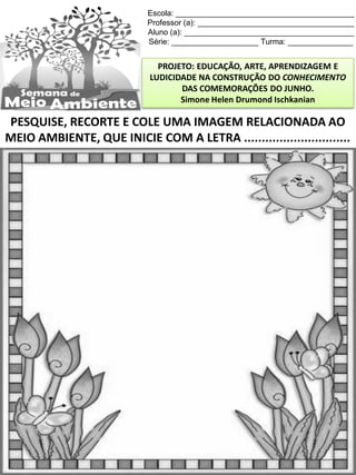 The document outlines an education project focused on art, learning, and playfulness in teaching students about commemorations in June. It provides tasks for students such as finding an image related to the environment starting with a given letter, free drawing, and pasting fruit gummies onto letters of the alphabet. The project aims to build knowledge about June commemorations through creative and fun activities.