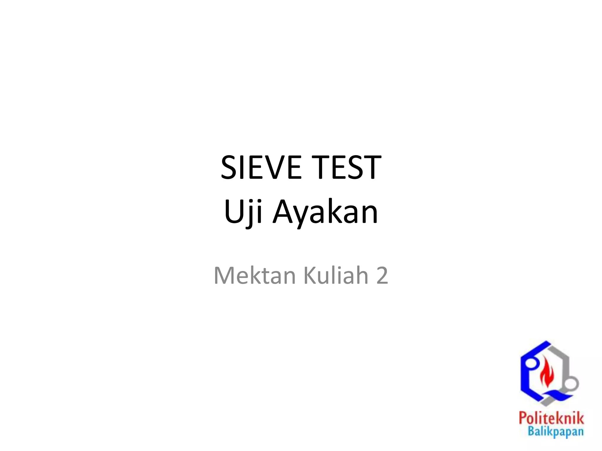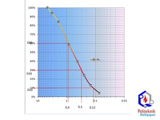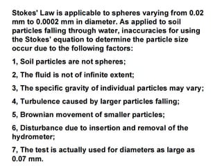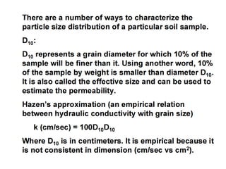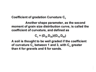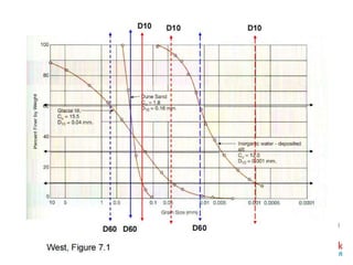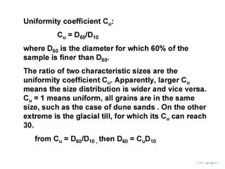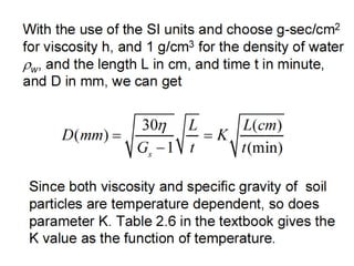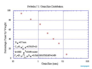 The document discusses procedures for determining soil particle size distribution through sieve and hydrometer tests. It provides definitions of soil, outlines sieve and hydrometer test procedures, and discusses relevant concepts like soil texture classes and particle shape. Sample calculations are shown for a sieve test involving determining particle sizes retained on various sieves, calculating percentages, and deriving distribution and uniformity coefficients. Practice problems are also provided to calculate coefficients based on given particle size data.