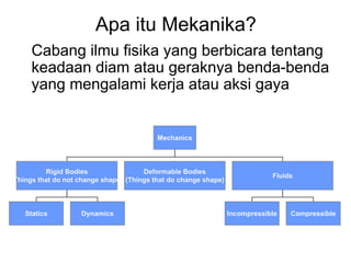 1) Mechanics deals with the static and dynamic behavior of bodies under the influence of forces or torques. This includes rigid bodies, deformable bodies, and fluids.