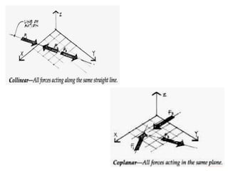 3) The equilibrium of a particle in 2D involves applying equations that set the sum of forces in the x and y directions equal to zero to solve for unknown forces or angles.