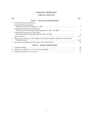 - McKesson Corporation filed a quarterly report with the SEC for the quarter ended September 30, 2001. - The report includes consolidated balance sheets, statements of operations, and statements of cash flows for the periods ended September 30, 2001 and 2000. - It also includes management's discussion and analysis of the company's financial condition and exhibits and reports filed with the SEC.