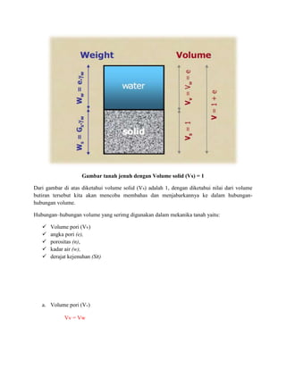 Dokumen ini membahas tentang mekanika tanah dengan fokus pada tanah jenuh yang terdiri dari dua fase, yaitu butiran dan air. Terdapat beberapa hubungan volume yang dijelaskan, termasuk volume pori, angka pori, porositas, kadar air, dan derajat kejenuhan. Konsep-konsep ini penting untuk memahami karakteristik tanah jenuh dalam konteks teknik sipil.