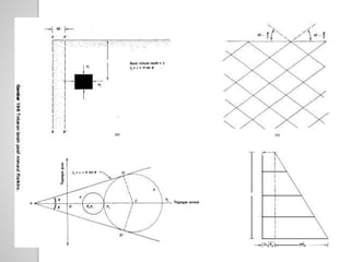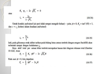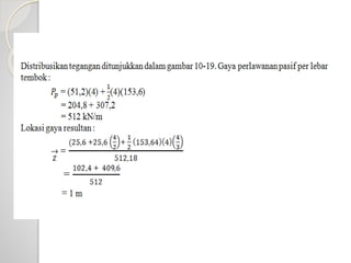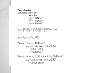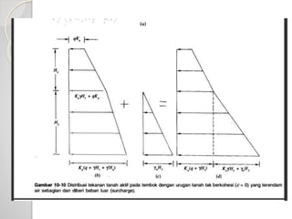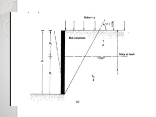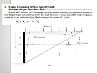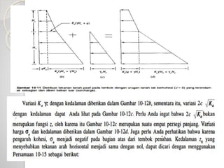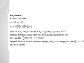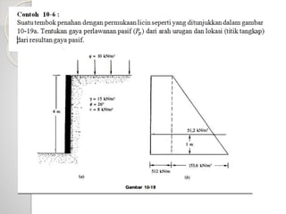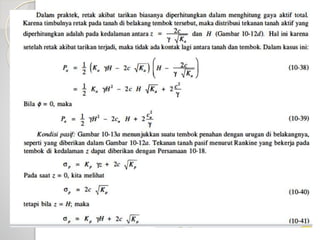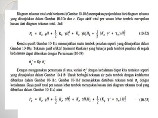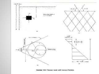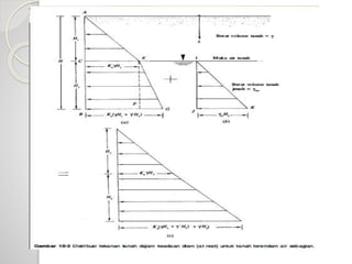 Dokumen tersebut membahas tentang tekanan tanah dalam keadaan diam, tekanan tanah aktif dan pasif menurut Rankine, serta diagram dan distribusi tekanan tanah ke samping yang bekerja pada tembok penahan. Topik utama mencakup konsep tekanan tanah dalam konstruksi penahan tanah seperti dinding penahan dan distribusi tekanannya pada berbagai kondisi tanah dan permukaan.
