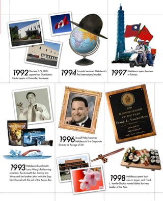 Melaleuca opened in 1985 with 9 employees and 8 products in Idaho Falls, Idaho. Over the following 25 years, Melaleuca grew rapidly, expanding its product line to over 300 products, employee base to over 3,000 employees, and entered 16 international markets. Melaleuca received numerous business awards and recognition over the years for its growth and success. Most importantly, Melaleuca helped enhance the lives of many customers by providing products for better health and nutrition as well as an independent business opportunity.