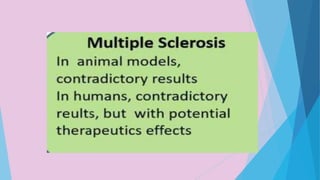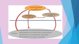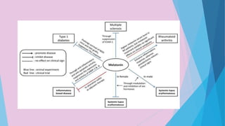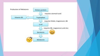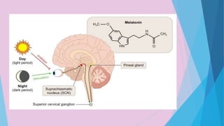 This document discusses melatonin, including its sources, receptors, biosynthesis, physiological roles, therapeutic uses, and causes of low levels. Melatonin is a hormone secreted in darkness that affects circadian rhythms and is found in many living things. It has roles in sleep, diabetes, and inflammatory conditions. Melatonin levels can be low due to factors like alcohol, caffeine, medications, and stress. Several melatonin supplements and medications are discussed for uses like insomnia, depression, and circadian rhythm disorders. Adverse effects are outlined for different doses.