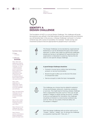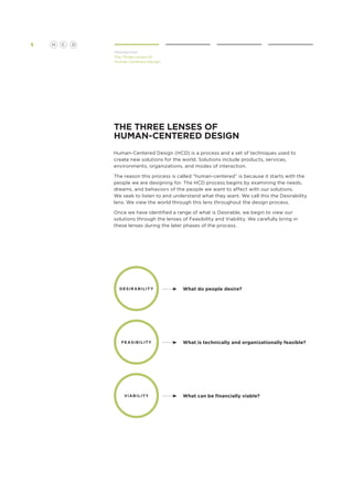 The document outlines a toolkit for design thinking, emphasizing the integration of human values, empathy, and collaboration throughout the design process. It highlights the importance of ideation, experimentation, and storytelling to generate impactful solutions and develop a clear understanding of challenges. Various methods are presented for brainstorming, synthesizing information, and evaluating potential solutions, encouraging a reflective and iterative approach to problem-solving.