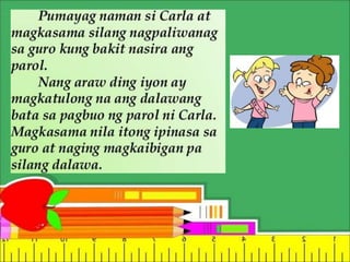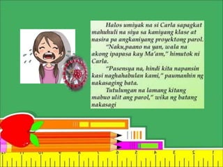 Ang dokumento ay naglalaman ng mga layunin at mga katanungan hinggil sa kahulugan ng pakikipagkapwa at pagtanggap ng pagkakamali. Tinutuklas nito ang mga hakbang sa paghingi ng paumanhin at ang pagpapahalaga sa pagkakaroon ng positibong kaugalian lalo na sa mga bata. Ipinapakita rin nito ang mga pangungusap na dapat suriin upang mas maunawaan ang mga sitwasyon ng pagtanggap at pagwawasto ng mga pagkakamali.