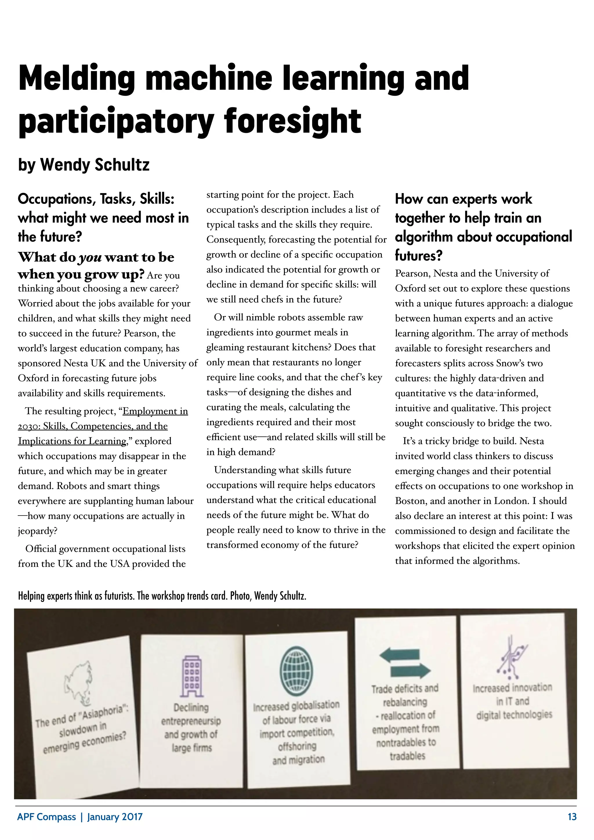 The document discusses a project sponsored by Pearson, Nesta UK, and the University of Oxford that forecasts future job availability and skills requirements for 2030. Through expert workshops and a machine learning algorithm, it explores which occupations may decline or grow, driven by technological advancements. The study emphasizes the importance of understanding future skills needs to prepare educators and workforce for upcoming economic changes.