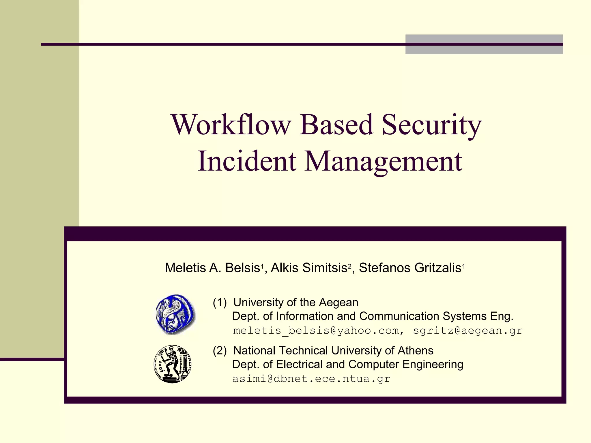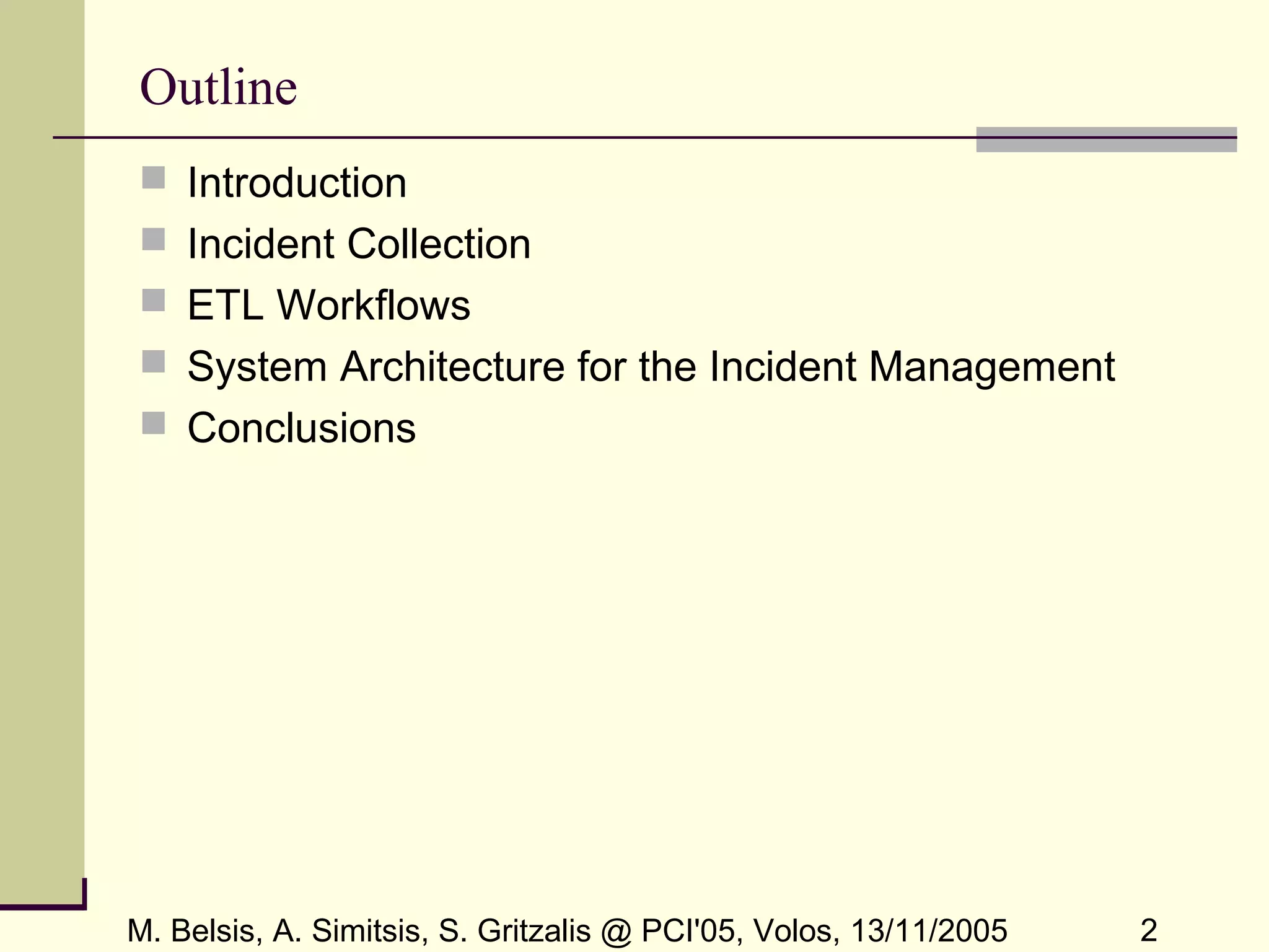 The document presents a framework for workflow-based security incident management, emphasizing the challenges of integrating data from various incident databases. It proposes a centralized incident database management system (DBMS) that utilizes ETL workflows for efficient collection, transformation, and loading of incident data. The goal is to facilitate incident correlation and improve law enforcement's ability to respond to security incidents by minimizing the time window for information dissemination.