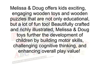 This document is an advertisement for Melissa & Doug wooden toys and puzzles that are educational yet fun for children. It highlights that the toys are beautifully crafted and illustrated to develop motor skills, cognitive thinking, and enrich playtime. It lists several puzzle and toy categories like arts & crafts, numbers, alphabet, and sound puzzles that are available from Melissa & Doug and can be found at local stores.