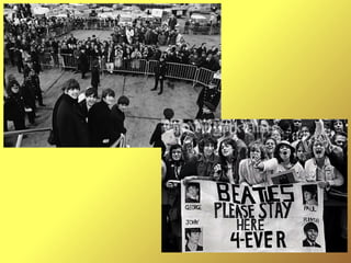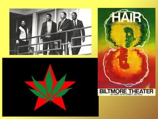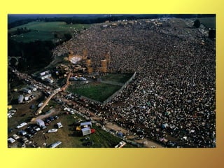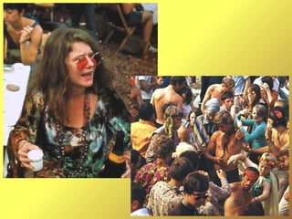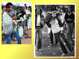 The document summarizes major events, trends, and popular culture of the late 1960s. It describes pivotal moments like the assassinations of MLK Jr. and RFK as well as the rise of the hippie movement. Music acts like the Beatles, Rolling Stones, and Jimi Hendrix dominated the era. Fashion evolved from mod styles to flower power looks. The 1960s also saw the rise of television and films like Star Trek while sports gained popularity through events like the first Super Bowl.