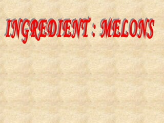 The document discusses the history, types, and uses of melons. It originated in Asia over 1000 years ago and is now grown worldwide. There are several types of melons including watermelon, honeydew, muskmelon, galia, and cantaloupe. Melons have a high water content and sweet flesh, and are eaten both as a starter and dessert, sometimes with ice cream or cured meats.