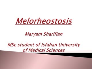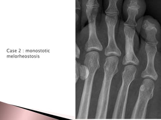 1. Melorheostosis is a rare mesenchymal dysplasia that produces thickened bone with a characteristic dripping wax appearance, most commonly affecting the limbs.