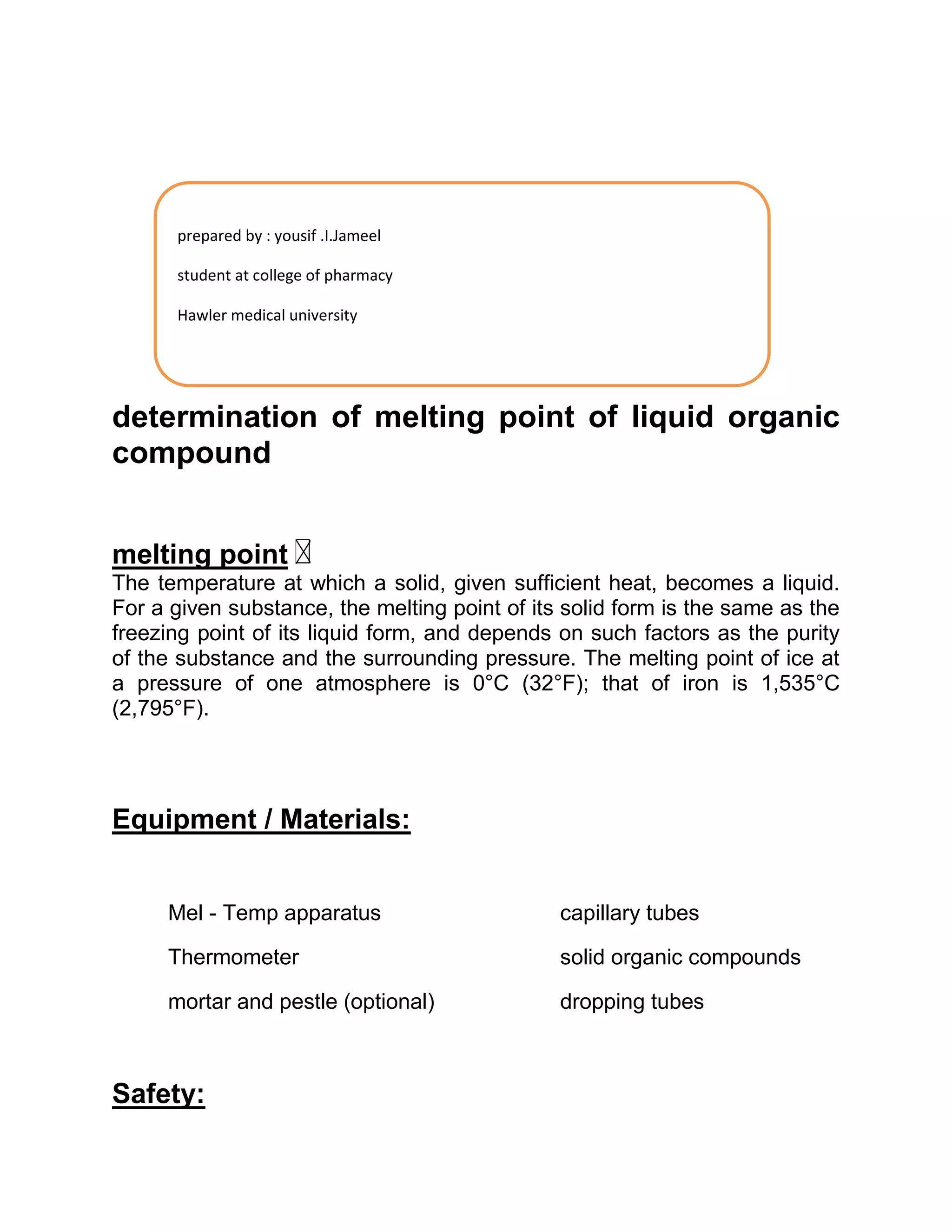 Yousif Jameel, a student at Hawler Medical University's College of Pharmacy, prepared this document on determining the melting point of organic compounds. The document discusses the equipment needed, safety precautions to follow, and factors that influence a substance's melting point such as molecular size, symmetry, and pressure. The purpose is to use melting point to determine purity, identify unknown compounds, and accurately obtain melting points using a Mel-Temp apparatus.