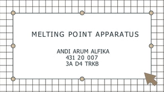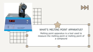 This document provides information about a melting point apparatus. It is a tool used to measure the melting point or melting range of a compound. It has components like electricity, an eyepiece, tube slot, display panel, heat control knob and extendible feet. To use it, a sample is inserted into a capillary tube and placed in the tube slot. The user turns it on, adjusts the heat, and observes the sample through the eyepiece to determine the melting point range.