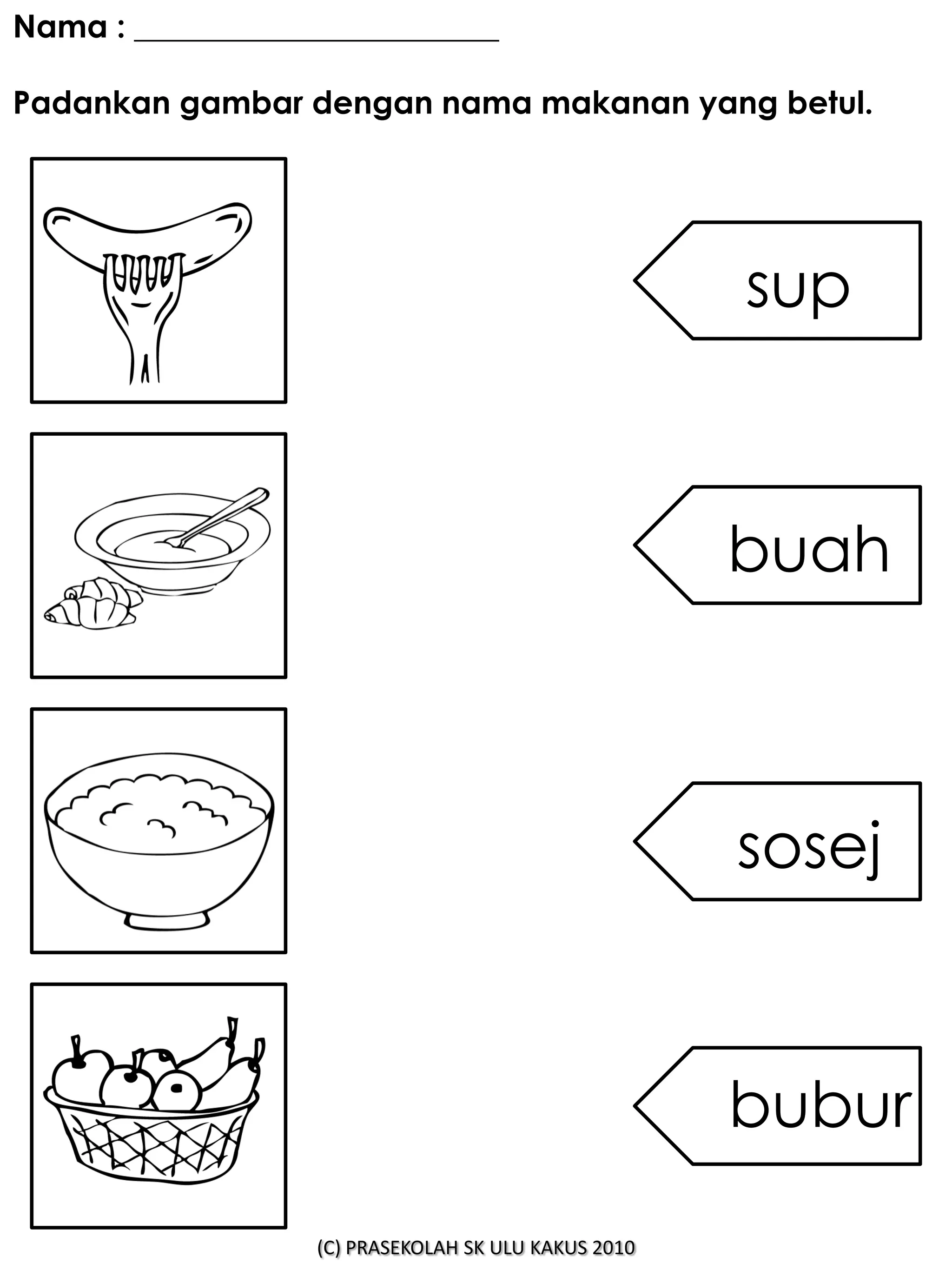 Dokumen ini merupakan aktiviti pendidikan untuk prasekolah yang melibatkan pelajar membuat padanan gambar dengan nama makanan yang betul. Terdapat empat kategori makanan yang termasuk ayam, sup, sandwic, dan kopi, antara lain. Aktiviti ini diadakan di SK Ulu Kakus pada tahun 2010.