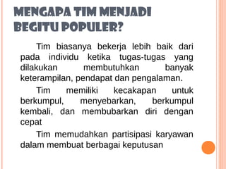 Dokumen tersebut membahas tentang kerja sama tim, termasuk definisi tim dan kelompok kerja, jenis-jenis tim seperti tim penyelesaian masalah, tim yang mengelola diri sendiri, tim lintas fungsional, dan tim virtual, serta karakteristik tim yang efektif seperti konteks, sumber daya, kepemimpinan, dan proses. Dokumen tersebut juga membahas tantangan mengubah budaya individualistis menjadi budaya tim dan cara membentuk pemain tim