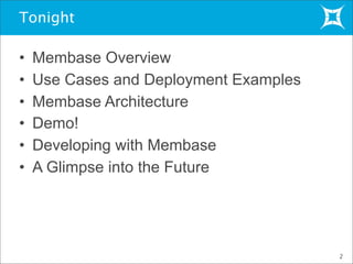 This document provides an overview and demonstration of Membase, a distributed database. It discusses how Membase can be deployed in five minutes or less on a single node or cluster. It is simple to develop applications using Membase's key-value interface without requiring a schema. The document also summarizes several use cases for Membase in domains like social games, advertising, and search/gaming portals. It provides a high-level overview of Membase's architecture, including its clustering functionality and TAP interface. Finally, it briefly previews Membase's NodeCode feature for extending the database with custom modules.