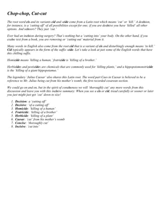 The document explores various English words derived from Greek and Latin roots related to love, cutting, deception, sending, shaping, learning, and time. Each section provides definitions and examples of words that share a common root, explaining their etymology and meanings. It highlights the importance of understanding these roots for deeper comprehension of language and vocabulary.