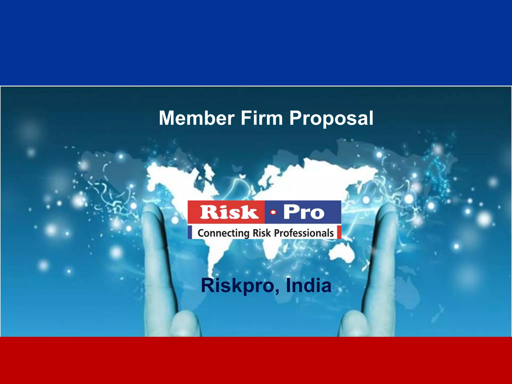 Riskpro is proposing a member firm partnership model. Key benefits of joining include access to Riskpro's brand, clients, expertise and network. Members would provide risk management consulting services locally under the Riskpro brand. The proposal outlines the application process, costs, standards, benefits and next steps to become a Riskpro member firm.