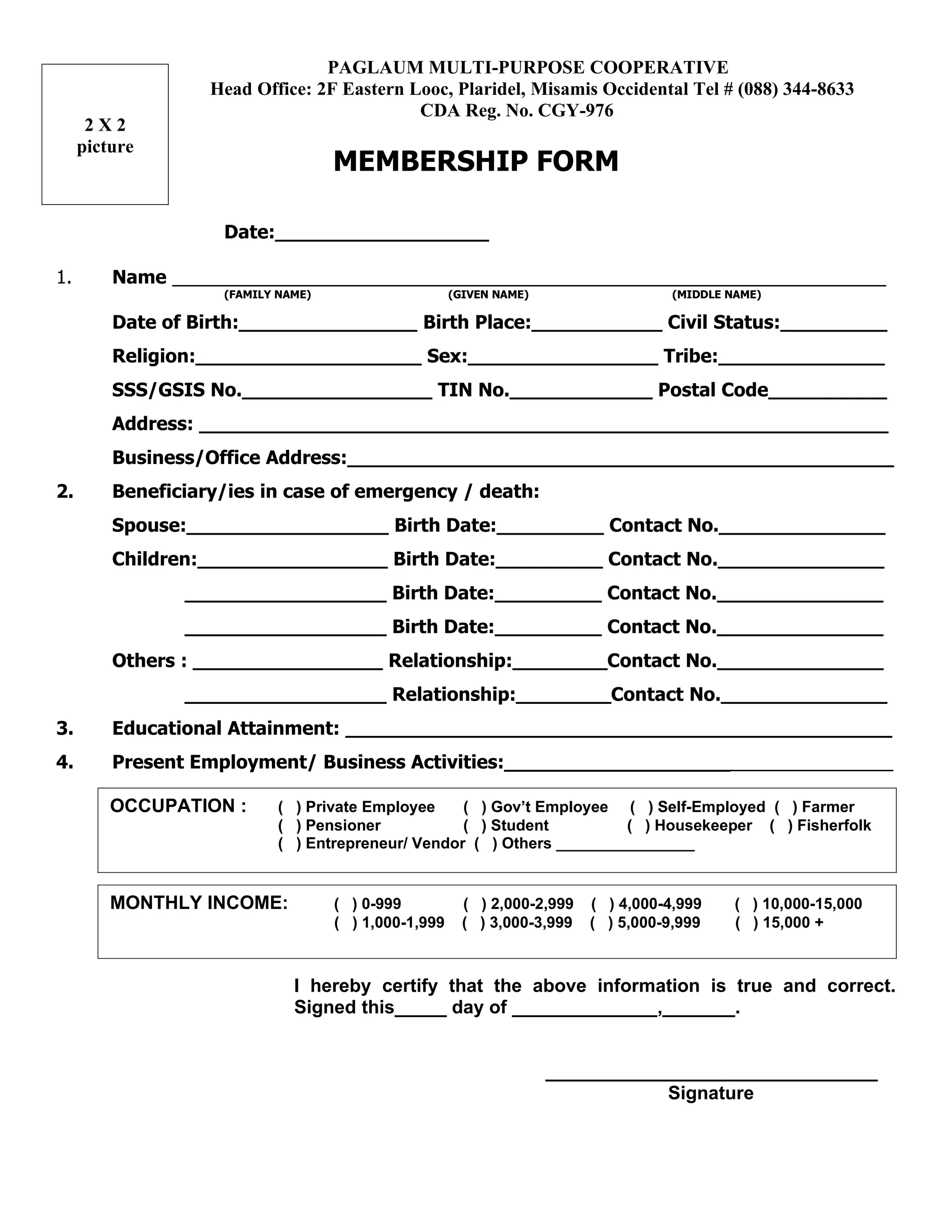 This document is a membership form for the Paglaum Multi-Purpose Cooperative. It requests personal information such as name, date of birth, contact details, employment, and income. The form also asks for emergency contact details and educational background. Applicants must sign to certify the accuracy of the provided information. A sponsor is also required to endorse each application.