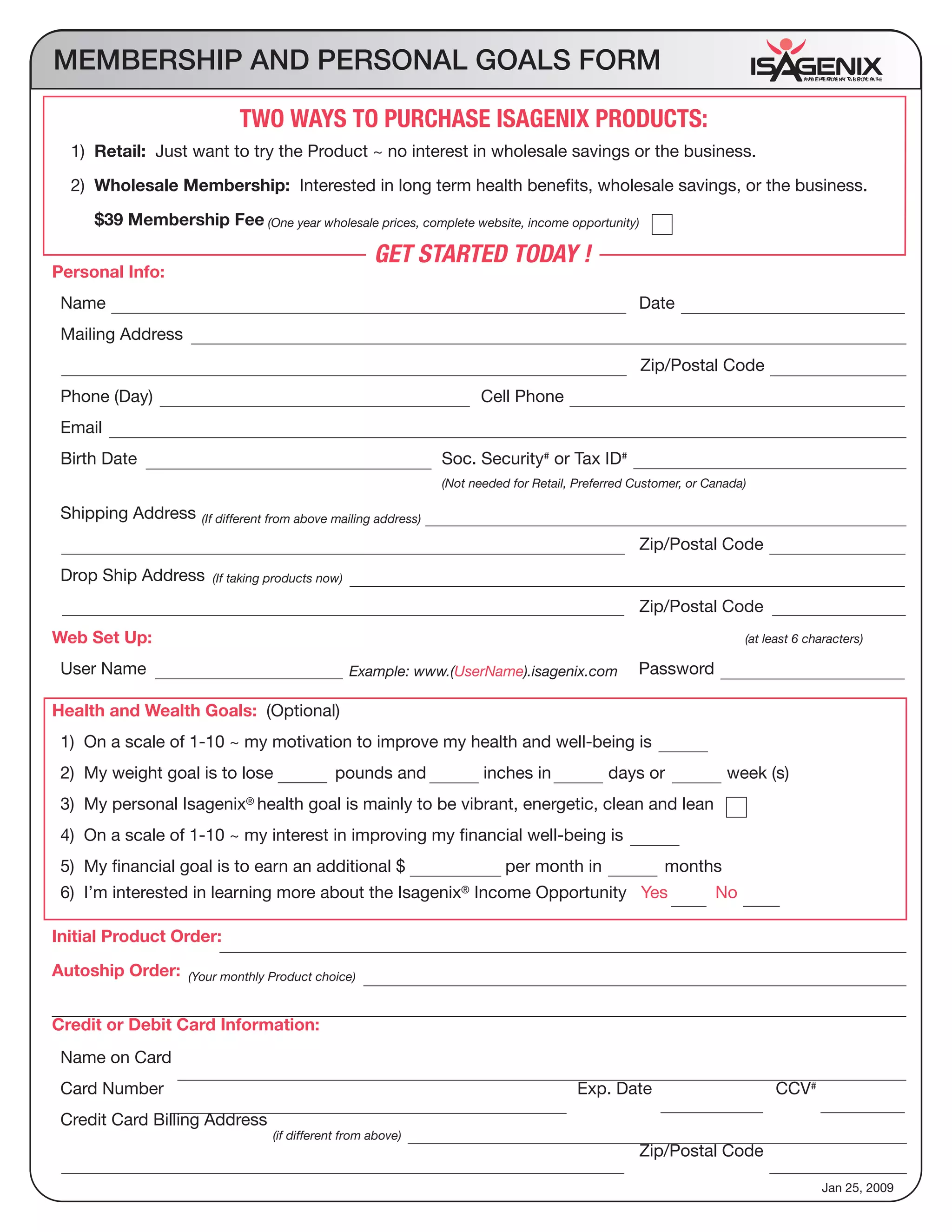 The document outlines two purchasing options for Isagenix products: retail for casual users and wholesale membership for those seeking long-term benefits or business opportunities. It details membership costs, initial product orders, and health and wealth goal tracking. Several product packages and prices are listed, along with additional add-ons and the benefits of membership.