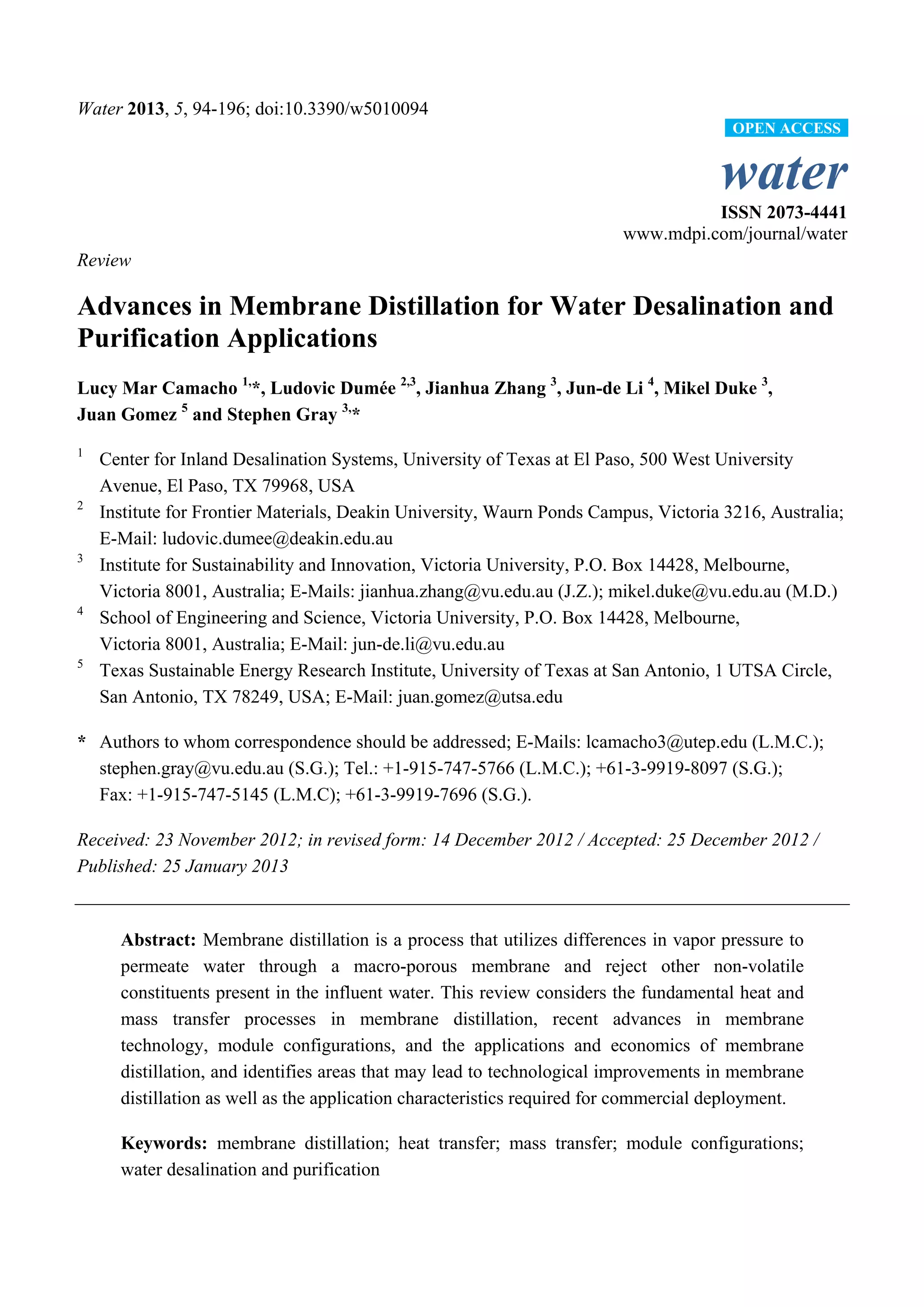 This document reviews advances in membrane distillation for water desalination and purification. It discusses the four main configurations of membrane distillation - direct contact, air gap, vacuum, and sweep gas membrane distillation. Direct contact has the highest flux but lowest energy efficiency, while air gap has the highest energy efficiency but lowest flux. The document also discusses tubular and plate-and-frame membrane module designs. Finally, it outlines the key membrane materials used - hollow fiber membranes made from PP, PVDF, and PVDF-PTFE and flat sheet membranes made from PP, PTFE, and PVDF.