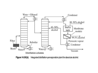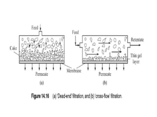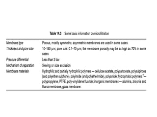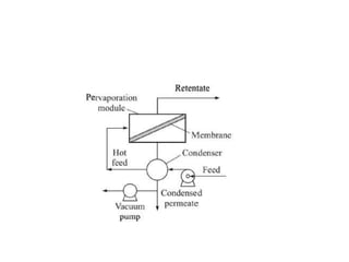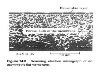 This document provides an overview of membrane separation processes. It discusses different types of membranes based on their structure like dense/non-porous, porous, asymmetric, composite and electrically charged membranes. It also describes various membrane separation techniques like microfiltration, ultrafiltration, reverse osmosis, dialysis, electrodialysis and pervaporation. Key applications and theoretical principles of each process are outlined. The document provides a comprehensive introduction to membrane separation technology.