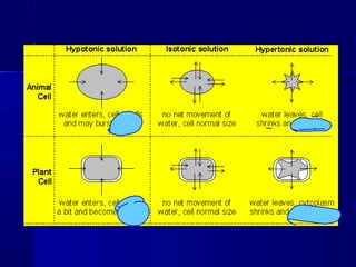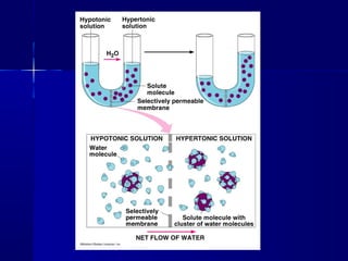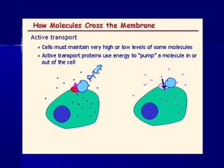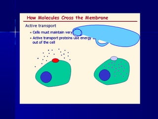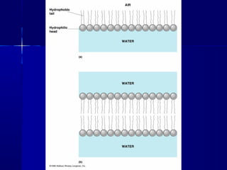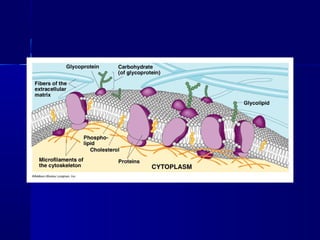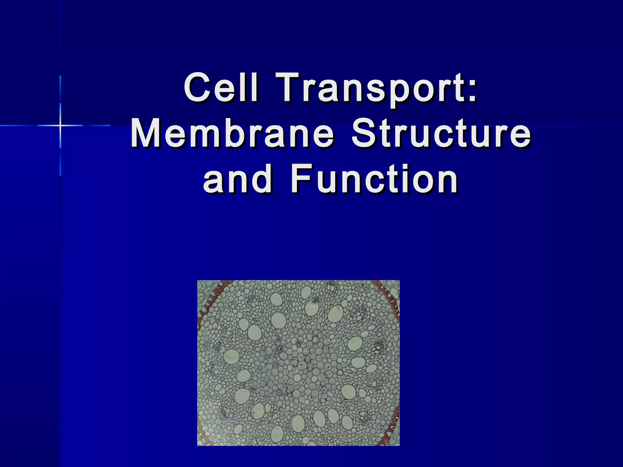 Membranes organize the chemical activities of cells by separating cells from their environments and controlling the passage of molecules. The cell membrane is a fluid mosaic of phospholipids and proteins that forms a selectively permeable bilayer. This structure allows materials to enter and exit cells through passive transport mechanisms like diffusion and osmosis, or active transport processes like endocytosis and exocytosis. Membrane proteins play important roles in these transport functions.