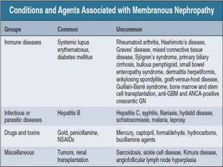 This document provides information on membranous nephropathy (MN), including its epidemiology, pathophysiology, pathology, clinical presentation, secondary causes, clinical course and outcomes, and treatment options. It notes that MN is a common cause of nephrotic syndrome in adults. The pathology involves immune complex deposition on the outer aspect of the glomerular basement membrane. Conservative management focuses on controlling edema, hypertension, and proteinuria. Cyclophosphamide combined with corticosteroids can be effective for idiopathic MN with nephrotic-range proteinuria, while the role of mycophenolate mofetil requires further study.