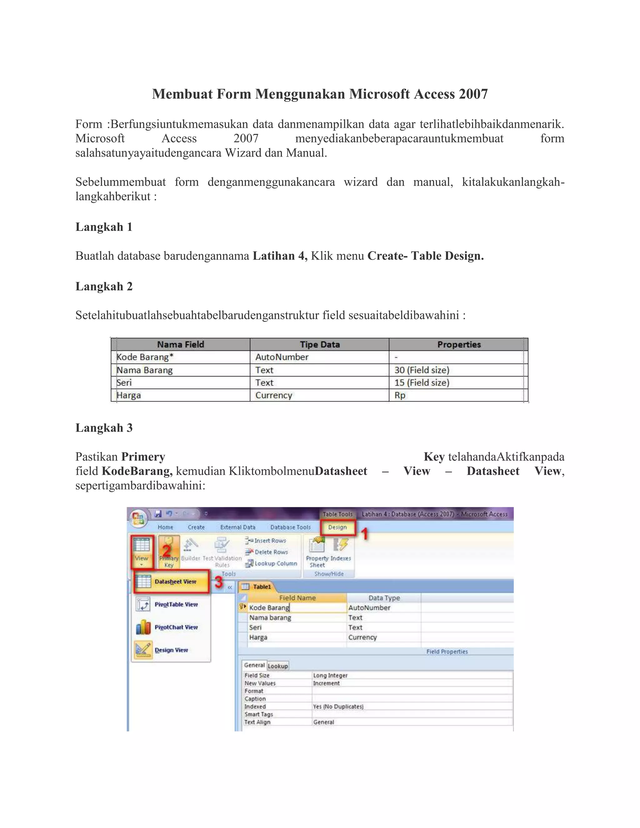 Dokumen tersebut memberikan instruksi langkah-langkah untuk membuat form data barang menggunakan Microsoft Access 2007 dengan cara manual dan wizard. Langkah-langkahnya meliputi pembuatan database dan tabel, pengaturan primary key, pengisian data, pembuatan form manual, penyimpanan form, dan pembuatan form menggunakan wizard.