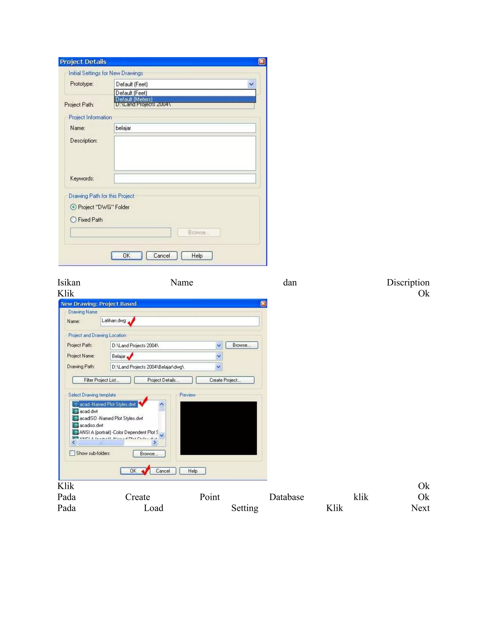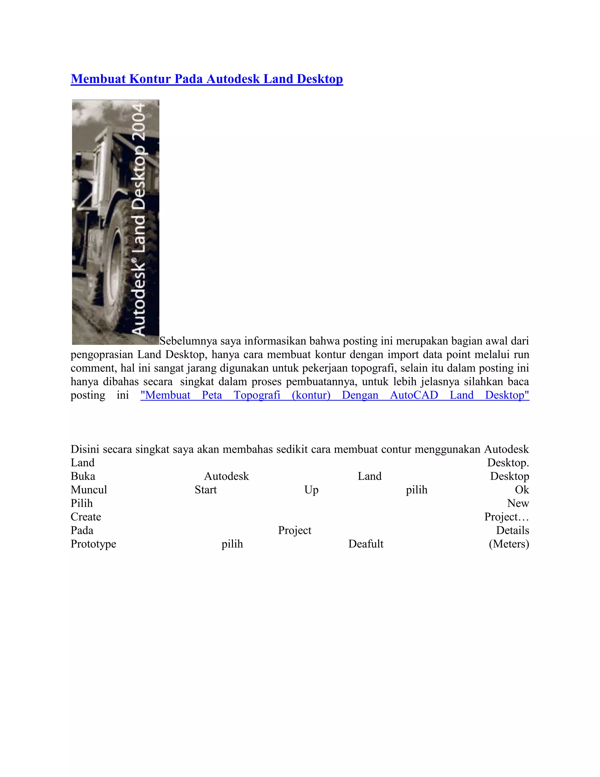 Dokumen tersebut menjelaskan cara membuat kontur pada Autodesk Land Desktop dengan 3 langkah utama: (1) mengimpor data point ketinggian dari Excel ke Land Desktop, (2) membangun permukaan digital dari data point, dan (3) menciptakan garis kontur dari permukaan digital tersebut beserta pengaturan gaya dan labelnya.
