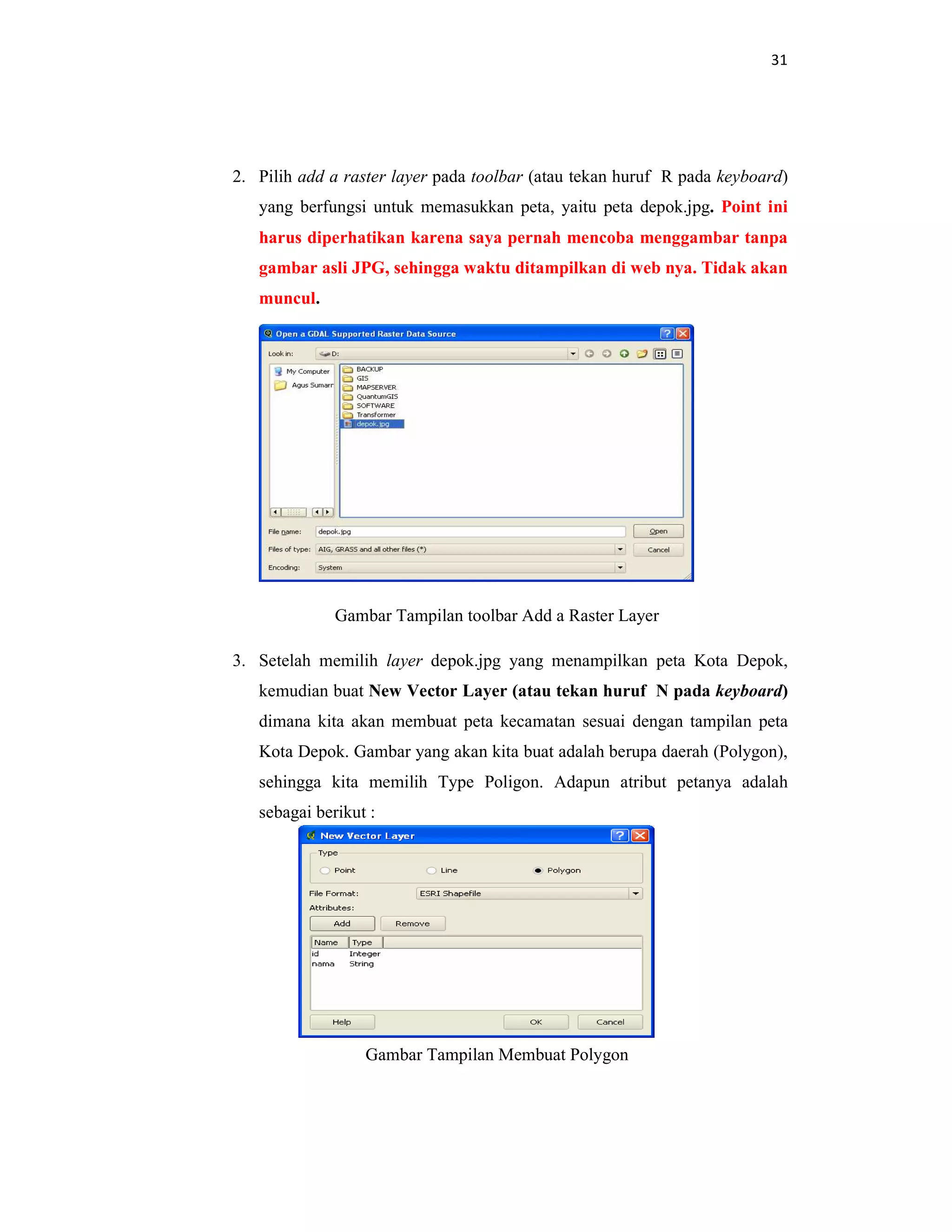 Dokumen ini menjelaskan langkah-langkah membuat peta digital dengan Quantum GIS, termasuk cara membuat poligon, titik, dan menyimpan data spasial ke dalam berbagai layer sesuai dengan tipe datanya seperti garis, poligon, dan titik. Langkah-langkahnya meliputi menginstal Quantum GIS, menambahkan raster dan membuat vector baru, menggambar objek spasial, memasukkan atribut data, menyimpan proyek.