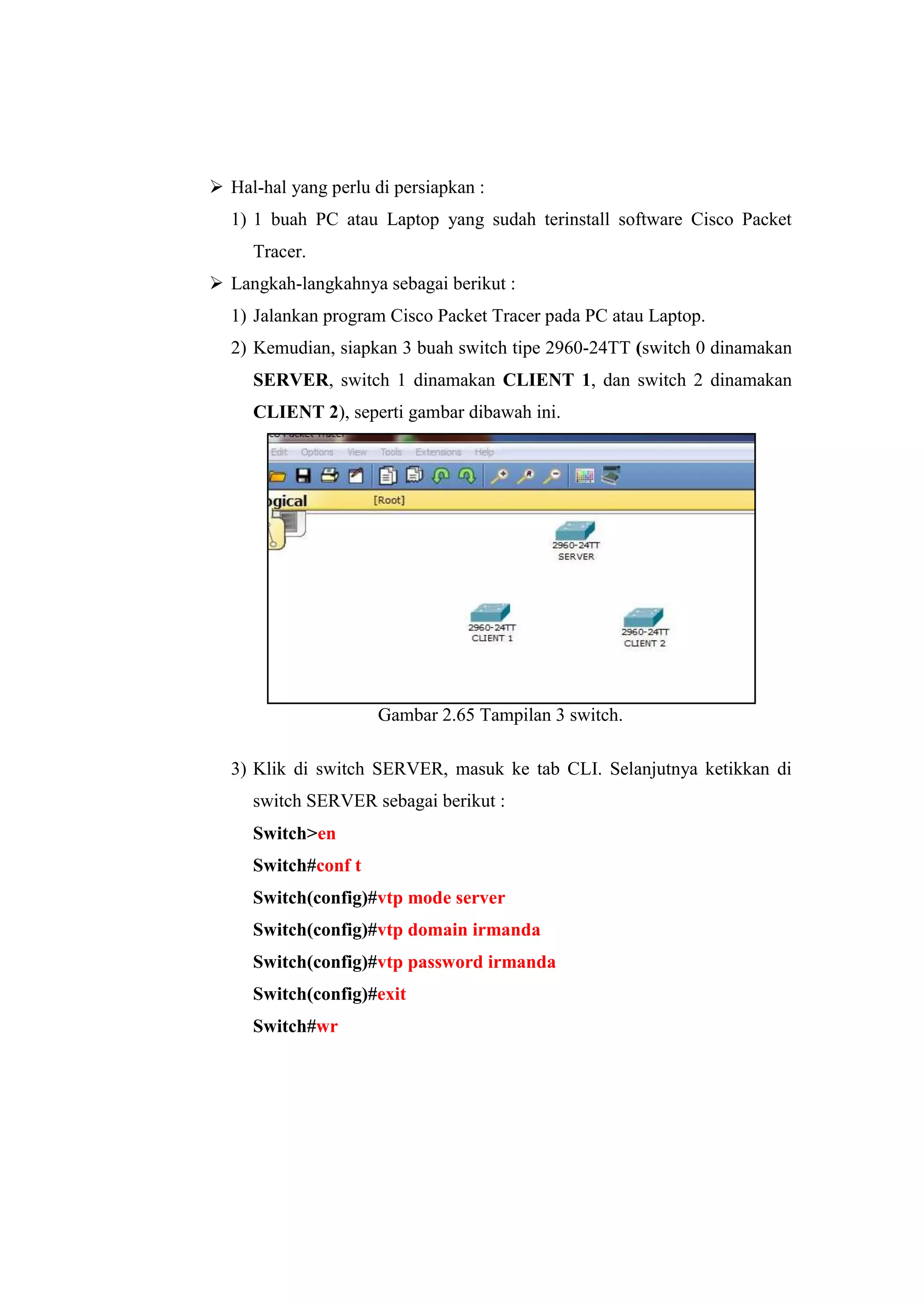 3) Konfigurasi VLAN pada Cisco Packet Tracer melibatkan pengaturan switch server, client, dan port trunk.