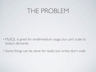 Memcached is an in-memory caching system that improves database performance by caching query results in RAM. It sits between applications and databases, intercepting reads to see if the requested data already exists in the cache. If so, it returns the cached version up to 165,000x faster than from disk. If not, it queries the database and caches the result. Memcached scales horizontally by adding more servers as load increases, distributing the cache transparently across servers. Many large sites use it to cache database queries, user profiles, and other frequently accessed data.
