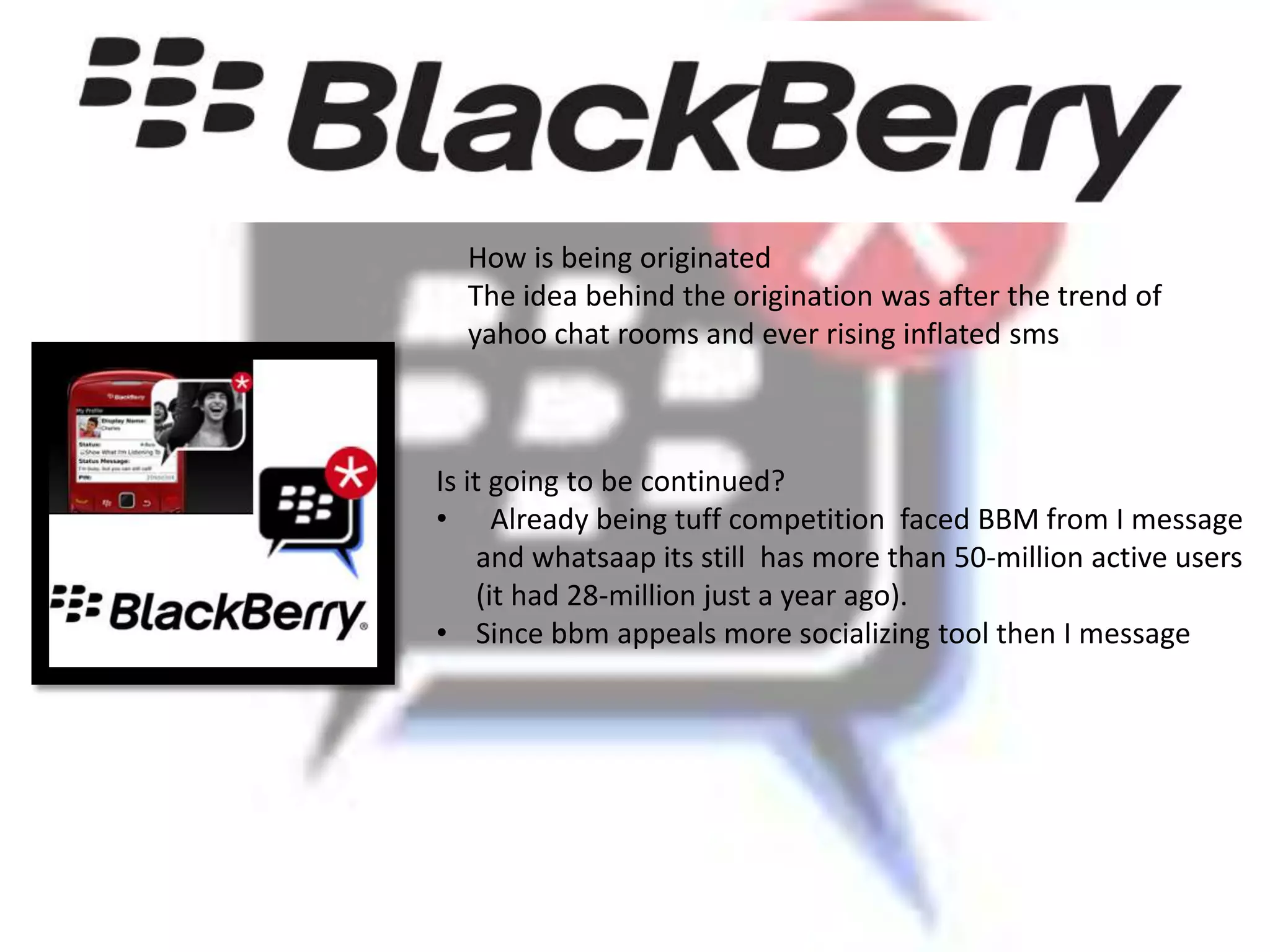 BBM originated as an alternative to Yahoo chat rooms and SMS messaging after their rise in popularity. While it faces competition from iMessage and WhatsApp, BBM still has over 50 million active users, up from 28 million last year, appealing as a social tool over iMessage. RIM has integrated BBM deeply into its devices, allowing sharing of photos, links, app recommendations, and a social music feature called BBM Music. Currently, WhatsApp has co-opted the BBM concept by working across all smartphones without requiring special plans, whereas BBM is limited to BlackBerry devices and may require additional charges.