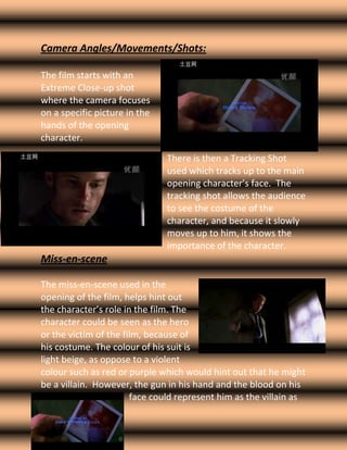 The film Memento is introduced with its studio logo and title credits for 1.3 seconds each. The first shot is an extreme close-up of a photograph held by the main character, then a tracking shot moves up to his face. Low key lighting and his distressed expression create a sinister tone. Sound includes non-diegetic music during the credits and diegetic camera flashes. It is unclear if the bloodied main character is the hero or villain from this opening sequence alone.
