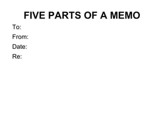 This document provides instructions on writing a memo, including the five typical parts of a memo and examples. It discusses the date format, courtesy titles, initials, names, phone numbers, meaning of "Re:", signatures, length of memos, and sample sentences. It concludes with a 15 question quiz to test the reader's understanding of proper memo formatting and content.