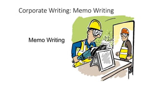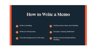 The document provides guidance on memo writing, including what a memo is, its purpose, and guidelines for formatting and writing memos. A memo is an internal communication tool used within organizations to inform people of new procedures, policies, or other official business. Memos serve to broadcast messages to audiences and keep employees informed. The key aspects of writing a memo outlined are including a heading with to, from, date, and subject lines; an introduction summarizing the purpose; background information; any action items or timelines; and a closing statement. Examples of memo formats, components, and a sample memo are also presented.