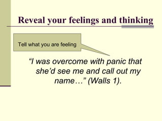 The document provides examples of memoir writing techniques from the work of author Jeannette Walls on page 1 of her book. It demonstrates summarizing key details about feelings, thoughts, sensory details, relationships, memories, and focusing on the author's experiences and reactions rather than just events. Specifically, it shows revealing panic at seeing her mother rooting through a dumpster, asking the driver to leave due to discomfort, recalling familiar memories of her mother's gestures and actions from childhood, and hating her own possessions and home after hiding from her mother in the taxi.
