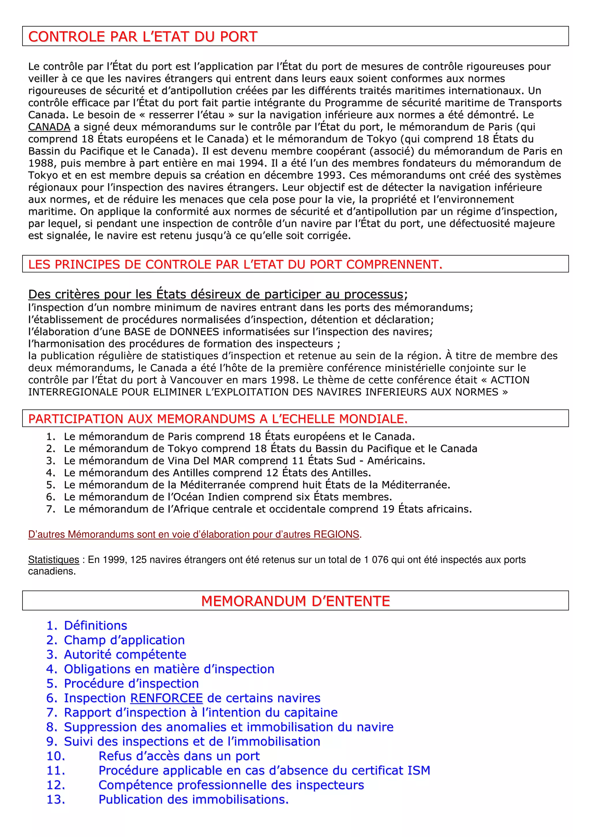 DDUU PPOORRTT LLee ccoonnttrrôôllee ppaarr ll’’ÉÉttaatt dduu ppoorrtt eesstt ll’’aapppplliiccaattiioonn ppaarr ll’’ÉÉttaatt dduu ppoorrtt ddee mmeessuurreess ddee ccoonnttrrôôllee rriiggoouurreeuusseess ppoouurr vveeiilllleerr àà ccee qquuee lleess nnaavviirreess ééttrraannggeerrss qquuii eennttrreenntt ddaannss lleeuurrss eeaauuxx ssooiieenntt ccoonnffoorrmmeess aauuxx nnoorrmmeess rriiggoouurreeuusseess ddee ssééccuurriittéé eett dd’’aannttiippoolllluuttiioonn ccrrééééeess ppaarr lleess ddiifffféérreennttss ttrraaiittééss mmaarriittiimmeess iinntteerrnnaattiioonnaauuxx.. UUnn ccoonnttrrôôllee eeffffiiccaaccee ppaarr ll’’ÉÉttaatt dduu ppoorrtt ffaaiitt ppaarrttiiee iinnttééggrraannttee dduu PPrrooggrraammmmee ddee ssééccuurriittéé mmaarriittiimmee ddee TTrraannssppoorrttss CCaannaaddaa.. LLee bbeessooiinn ddee «« rreesssseerrrreerr ll’’ééttaauu »» ssuurr llaa nnaavviiggaattiioonn iinnfféérriieeuurree aauuxx nnoorrmmeess aa ééttéé ddéémmoonnttrréé.. LLee CCAANNAADDAA aa ssiiggnnéé ddeeuuxx mméémmoorraanndduummss ssuurr llee ccoonnttrrôôllee ppaarr ll’’ÉÉttaatt dduu ppoorrtt,, llee mméémmoorraanndduumm ddee PPaarriiss ((qquuii ccoommpprreenndd 1188 ÉÉttaattss eeuurrooppééeennss eett llee CCaannaaddaa)) eett llee mméémmoorraanndduumm ddee TTookkyyoo ((qquuii ccoommpprreenndd 1188 ÉÉttaattss dduu BBaassssiinn dduu PPaacciiffiiqquuee eett llee CCaannaaddaa)).. IIll eesstt ddeevveennuu mmeemmbbrree ccooooppéérraanntt ((aassssoocciiéé)) dduu mméémmoorraanndduumm ddee PPaarriiss eenn 11998888,, ppuuiiss mmeemmbbrree àà ppaarrtt eennttiièèrree eenn mmaaii 11999944.. IIll aa ééttéé ll’’uunn ddeess mmeemmbbrreess ffoonnddaatteeuurrss dduu mméémmoorraanndduumm ddee TTookkyyoo eett eenn eesstt mmeemmbbrree ddeeppuuiiss ssaa ccrrééaattiioonn eenn ddéécceemmbbrree 11999933.. CCeess mméémmoorraanndduummss oonntt ccrréééé ddeess ssyyssttèèmmeess rrééggiioonnaauuxx ppoouurr ll’’iinnssppeeccttiioonn ddeess nnaavviirreess ééttrraannggeerrss.. LLeeuurr oobbjjeeccttiiff eesstt ddee ddéétteecctteerr llaa nnaavviiggaattiioonn iinnfféérriieeuurree aauuxx nnoorrmmeess,, eett ddee rréédduuiirree lleess mmeennaacceess qquuee cceellaa ppoossee ppoouurr llaa vviiee,, llaa pprroopprriiééttéé eett ll’’eennvviirroonnnneemmeenntt mmaarriittiimmee.. OOnn aapppplliiqquuee llaa ccoonnffoorrmmiittéé aauuxx nnoorrmmeess ddee ssééccuurriittéé eett dd’’aannttiippoolllluuttiioonn ppaarr uunn rrééggiimmee dd’’iinnssppeeccttiioonn,, ppaarr lleeqquueell,, ssii ppeennddaanntt uunnee iinnssppeeccttiioonn ddee ccoonnttrrôôllee dd’’uunn nnaavviirree ppaarr ll’’ÉÉttaatt dduu ppoorrtt,, uunnee ddééffeeccttuuoossiittéé mmaajjeeuurree eesstt ssiiggnnaallééee,, llee nnaavviirree eesstt rreetteennuu jjuussqquu’’àà ccee qquu’’eellllee ssooiitt ccoorrrriiggééee.. LLEESS PPRRIINNCCIIPPEESS DDEE CCOONNTTRROOLLEE PPAARR LL’’EETTAATT DDUU PPOORRTT CCOOMMPPRREENNNNEENNTT.. DDeess ccrriittèèrreess ppoouurr lleess ÉÉttaattss ddééssiirreeuuxx ddee ppaarrttiicciippeerr aauu pprroocceessssuuss;; ll’’iinnssppeeccttiioonn dd’’uunn nnoommbbrree mmiinniimmuumm ddee nnaavviirreess eennttrraanntt ddaannss lleess ppoorrttss ddeess mméémmoorraanndduummss;; ll’’ééttaabblliisssseemmeenntt ddee pprrooccéédduurreess nnoorrmmaalliissééeess dd’’iinnssppeeccttiioonn,, ddéétteennttiioonn eett ddééccllaarraattiioonn;; ll’’ééllaabboorraattiioonn dd’’uunnee BBAASSEE ddee DDOONNNNEEEESS iinnffoorrmmaattiissééeess ssuurr ll’’iinnssppeeccttiioonn ddeess nnaavviirreess;; ll’’hhaarrmmoonniissaattiioonn ddeess pprrooccéédduurreess ddee ffoorrmmaattiioonn ddeess iinnssppeecctteeuurrss ;; la publication régulière de statistiques d’inspection et retenue au sein de la région. À titre de membre des deux mémorandums, le Canada a été l’hôte de la première conférence ministérielle conjointe sur le contrôle par l’État du port à Vancouver en mars 1998. Le thème de cette conférence était « ACTION INTERREGIONALE POUR ELIMINER L’EXPLOITATION DES NAVIRES INFERIEURS AUX NORMES » PPAARRTTIICCIIPPAATTIIOONN AAUUXX MMEEMMOORRAANNDDUUMMSS AA LL’’EECCHHEELLLLEE MMOONNDDIIAALLEE.. 11.. LLee mméémmoorraanndduumm ddee PPaarriiss ccoommpprreenndd 1188 ÉÉttaattss eeuurrooppééeennss eett llee CCaannaaddaa.. 22.. LLee mméémmoorraanndduumm ddee TTookkyyoo ccoommpprreenndd 1188 ÉÉttaattss dduu BBaassssiinn dduu PPaacciiffiiqquuee eett llee CCaannaaddaa 33.. LLee mméémmoorraanndduumm ddee VViinnaa DDeell MMAARR ccoommpprreenndd 1111 ÉÉttaattss SSuudd -- AAmméérriiccaaiinnss.. 44.. LLee mméémmoorraanndduumm ddeess AAnnttiilllleess ccoommpprreenndd 1122 ÉÉttaattss ddeess AAnnttiilllleess.. 55.. LLee mméémmoorraanndduumm ddee llaa MMééddiitteerrrraannééee ccoommpprreenndd hhuuiitt ÉÉttaattss ddee llaa MMééddiitteerrrraannééee.. 66.. LLee mméémmoorraanndduumm ddee ll’’OOccééaann IInnddiieenn ccoommpprreenndd ssiixx ÉÉttaattss mmeemmbbrreess.. 77.. LLee mméémmoorraanndduumm ddee ll’’AAffrriiqquuee cceennttrraallee eett oocccciiddeennttaallee ccoommpprreenndd 1199 ÉÉttaattss aaffrriiccaaiinnss.. D’autres Mémorandums sont en voie d’élaboration pour d’autres REGIONS. Statistiques : En 1999, 125 navires étrangers ont été retenus sur un total de 1 076 qui ont été inspectés aux ports canadiens. MMEEMMOORRAANNDDUUMM DD’’EENNTTEENNTTEE 11.. DDééffiinniittiioonnss 22.. CChhaammpp dd’’aapppplliiccaattiioonn 33.. AAuuttoorriittéé ccoommppéétteennttee 44.. OObblliiggaattiioonnss eenn mmaattiièèrree dd’’iinnssppeeccttiioonn 55.. PPrrooccéédduurree dd’’iinnssppeeccttiioonn 66.. IInnssppeeccttiioonn RREENNFFOORRCCEEEE ddee cceerrttaaiinnss nnaavviirreess 77.. RRaappppoorrtt dd’’iinnssppeeccttiioonn àà ll’’iinntteennttiioonn dduu ccaappiittaaiinne