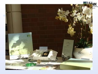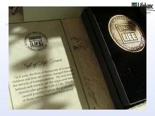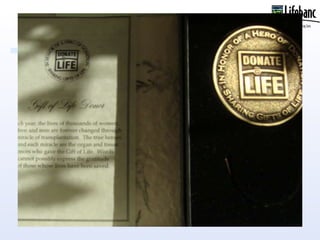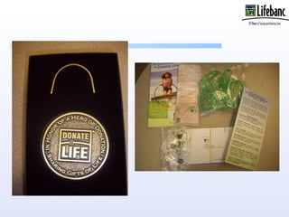 Lifebanc has a Gift of Life Memorial Program where they provide a memory box for families who accept organ donation from a loved one. The memory box contains materials that are delivered to the funeral home or directly to the family. The family can then display and distribute the contents of the memory box at the memorial service for the deceased.