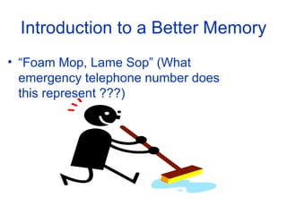The document discusses the history of memorization techniques dating back to ancient Greece. It provides examples of visualization techniques like associating numbers with sounds and images to remember numbers like phone numbers or area codes. The document encourages practicing these memory techniques to improve one's ability to recall information and notes that while it takes practice, memory can be improved.