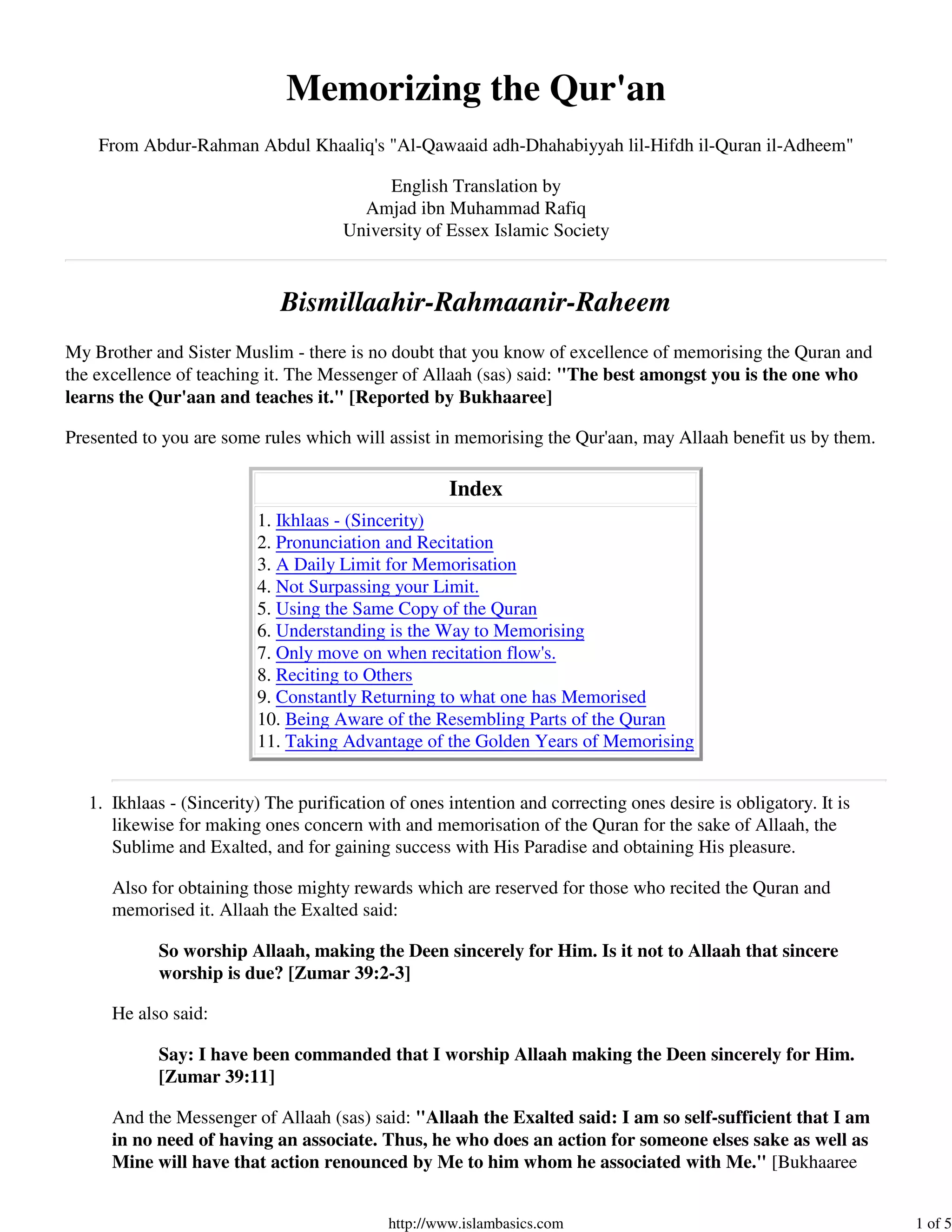 The document provides 11 rules to assist with memorizing the Quran effectively: 1) Have sincerity in intentions; 2) Correct pronunciation; 3) Set a daily memorization limit; 4) Perfect memorization before moving on; 5) Use the same Quran copy; 6) Understanding aids memorization; 7) Connect sections before moving on; 8) Recite to others for testing; 9) Constantly review memorized parts; 10) Be aware of similar passages; 11) Take advantage of the "golden years" from ages 5-23 for memorizing. Following these rules will help internalize the Quran and gain Allah's rewards for memorization.