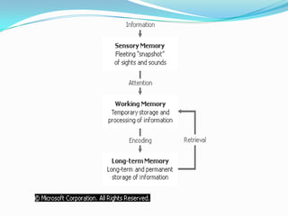 This document provides an overview of memory from an information processing perspective. It discusses the main stages of memory as encoding, storage, and retrieval. It also describes the different types of memory, including sensory memory, short-term memory, and long-term memory. Various concepts related to memory are explained such as forgetting, déjà vu, flashbulb memories, and improving memory through techniques like chunking and mnemonic devices.