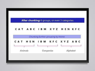 Memory is the ability to encode, store, and recall past experiences. It involves three main processes: encoding, where information is absorbed by the brain; storage, where memories are kept in the brain over time; and retrieval, where memories are recalled. There are several types of memory, including short-term/working memory for temporary recall, and long-term memory which is divided into declarative and non-declarative types. Many factors influence memory, including physical and mental health, motivation, the method of learning, and testing. Common techniques for improving memory include repetition, association, visualization, and the use of mnemonic devices.