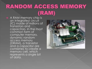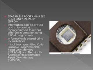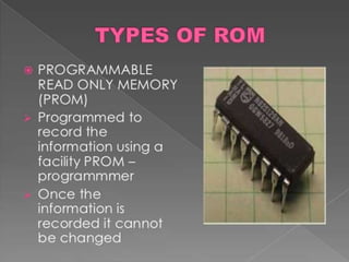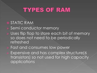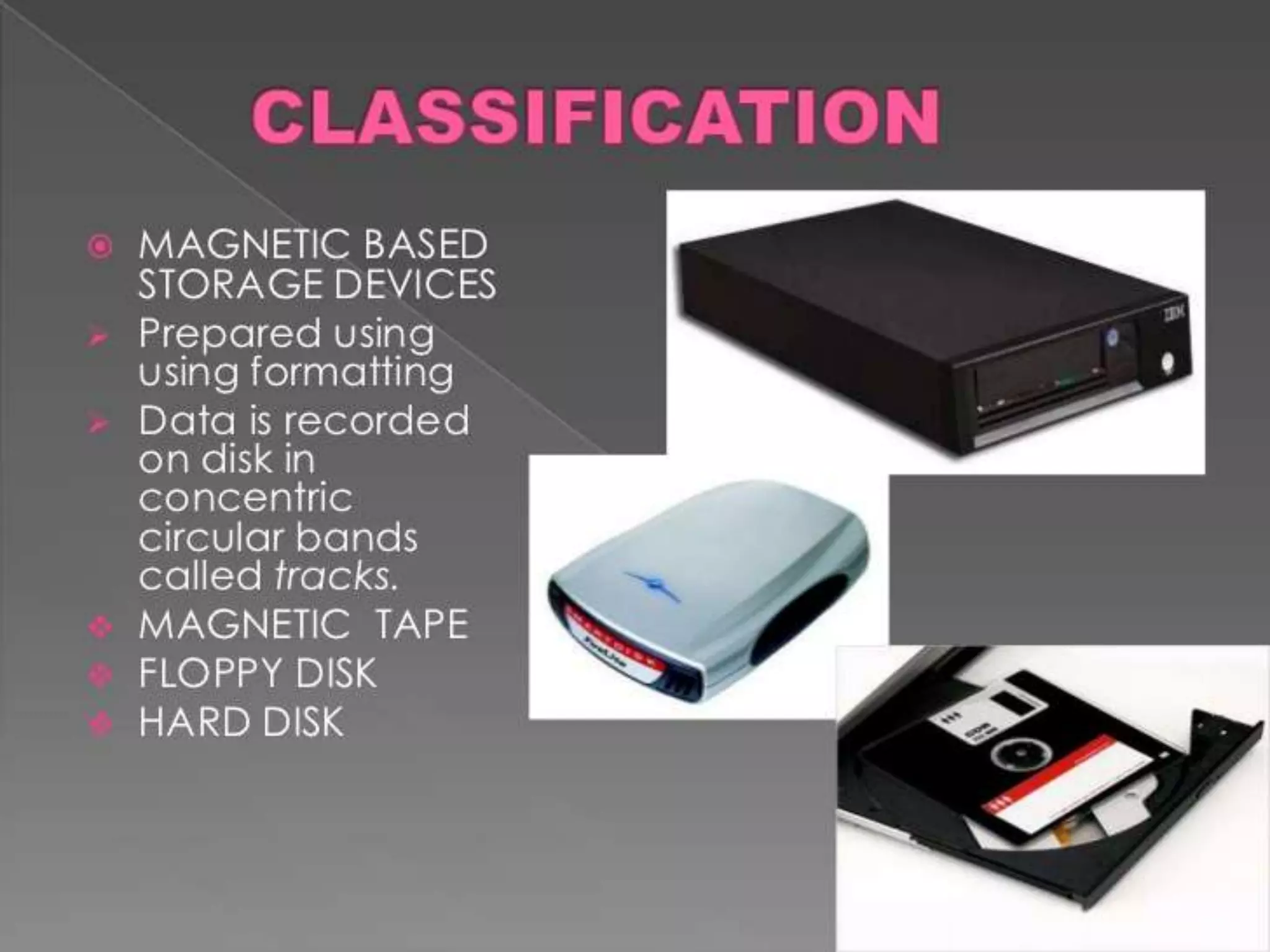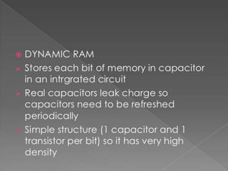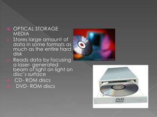 This document provides an overview of different storage types and devices in computer systems, including hard drives, floppy disks, and optical storage like CD/DVD. It categorizes storage by their operations, access methods, technologies, and hierarchies, explaining concepts such as online, near-online, and offline storage. Additionally, it discusses the performance metrics of storage devices, including capacity and access times.